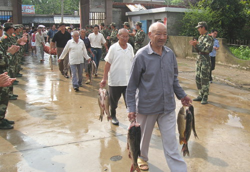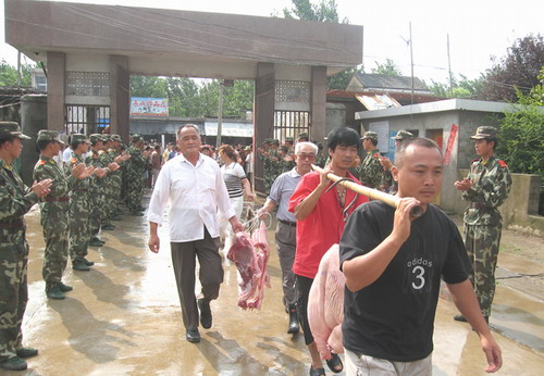 7月25日上午,焦岗湖农场男女老幼50余人在场领导带领下再次赶往增援焦岗湖防汛抗洪的武警安徽省总队临时驻地--鲁口镇中学,为他们送上500斤鱼、500斤肉和6大袋洋葱----再谱拥军崭新篇章。