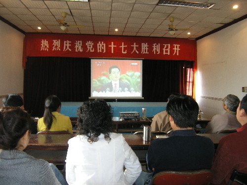 10月15日上午,安徽省潘村湖农场机关党支部组织全体工作人员集中收看党的十七大开幕盛况,认真聆听了胡锦涛总书记作的大会报告。(杨登宏摄)