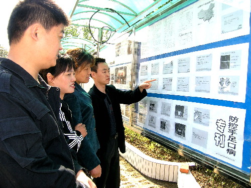 5月13日上午,在安徽省潘村湖农场场部宣传栏前,几名职工群众正在驻足观看“防控手足口病专刊”。连日来,该场通过广播、内刊、橱窗等形式集中宣传普及手足口病防控知识,受到群众欢迎。(杨登宏摄)
