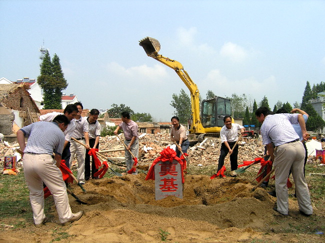 潘村湖农场场长韩大鸣,承建单位——皖垦建筑公司党委书记刘会满及监理单位负责人分别在开工典礼上讲话。在喜庆的爆竹和音乐声中,各位来宾和农场领导为工程开工奠基。