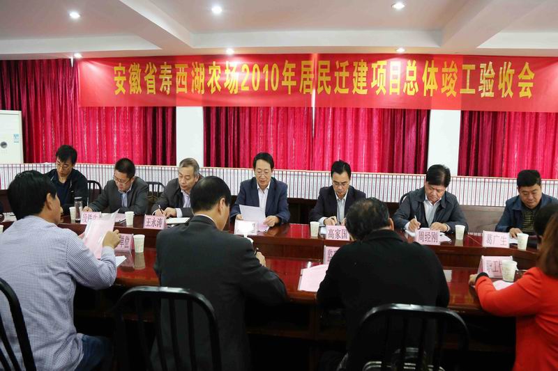 1019,安徽农垦集团总经理刘超主持召开寿西湖农场2010居民迁建项目总体竣工验收会。省发改委水库移民局副局长高家国及综合处处长王永涛,寿县住建局及质监站、集团社会事业部、寿西湖农场等单位组成的专家组参加验收。