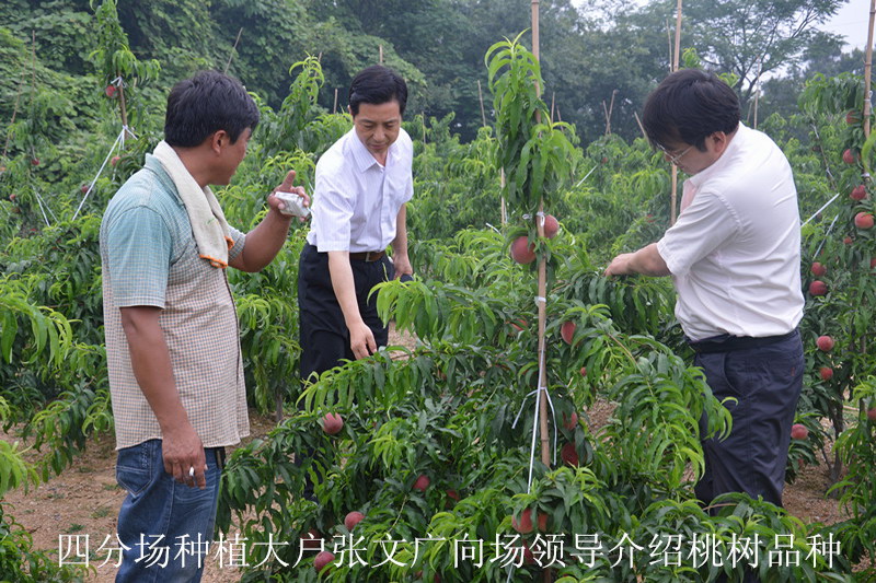 近几年来,该农场积极响应省农垦集团发展高效农业促职工增收、农场增效的部署要求,立足白米山立地条件,积极调整种植结构,大力发展高效经果林,2012年以来,已发展良种桃园2000余亩。农场从砀山、徐州等地引进果树种植能手,示范引领职工发展良种桃种植,引进了春蜜、春雪、探春、满园红等优良品种,科学栽培,矮化密植,早熟丰产。定植第2年亩产近千斤,今年6月初即上市,南京市场批发价达到6-8元/斤,效益可观,预计今年全场良种桃总产量达50万斤。